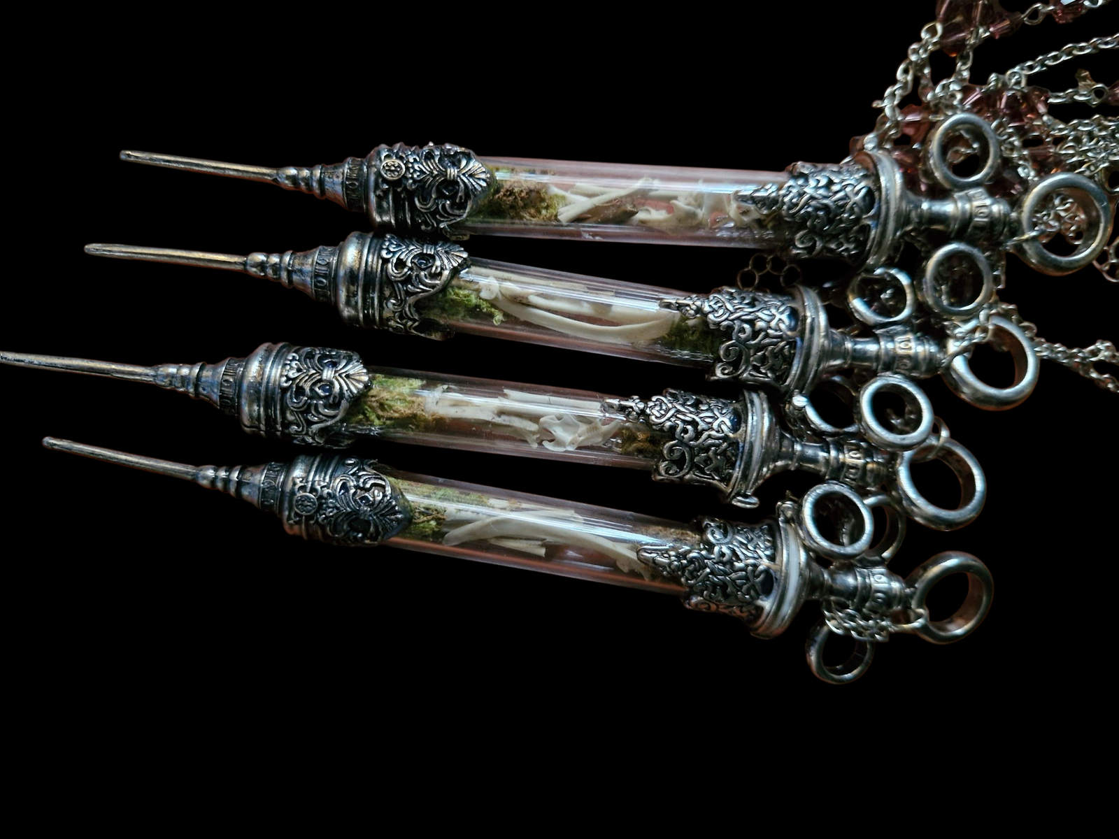 Choose from three distinct designs, each crafted with exquisite detail. Opt for small mammal animal bones naturally sourced from owl pellets, intricate resin reproduction teeth, or carefully selected crystals that bring an added sparkle to your ensemble. Each option tells its own enchanting story.